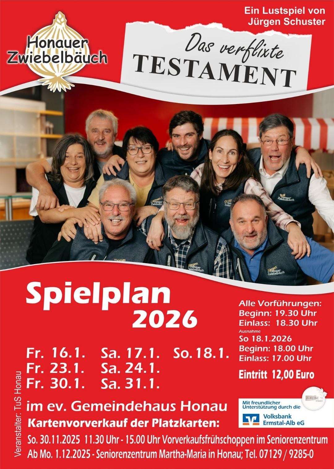 Die Theatersaison steht vor der Tür – und unsere Honauer Zwiebelbäuch freuen sich riesig darauf, das Publikum wieder mit viel Humor, Herz und Spielfreude zu begeistern! Im kommenden Jahr steht das Lustspiel „Das verflixtе Testament“ von Jürgen Schuster auf dem Programm – eine turbulente Geschichte voller überraschender Wendungen, schräger Charaktere und echter Lachgarantie.